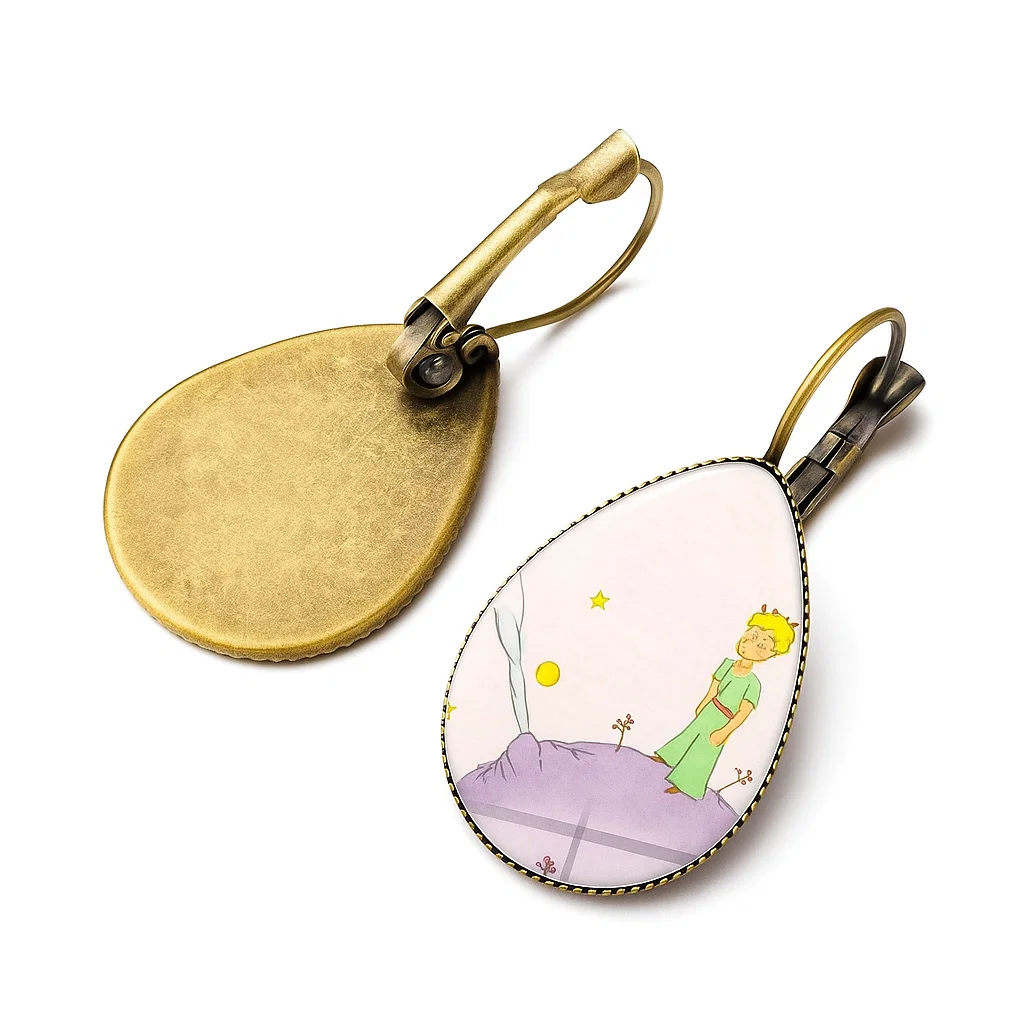 Ez a különleges A kis herceg fülbevaló minden rajongó számára tökéletes kiegészítő, amely magában hordozza Antoine de Saint-Exupéry varázslatos történetének üzenetét. A színes illusztráció a kis herceg ikonikus alakját ábrázolja, finom bronz keretbe foglalva, amely vintage hangulatot kölcsönöz az ékszernek. Az üvegborítás fényes felülete kiemeli a részleteket, így minden alkalommal rabul ejti a tekintetet.