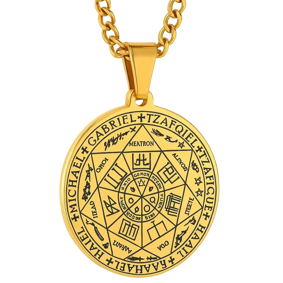 Ez a rozsdamentes acél nyaklánc arany színű bevonatot kapott, így hosszú távon is megőrzi ragyogását. A 3 cm átmérőjű medált 60 cm-es lánc tartja, amely biztosítja a kényelmes viseletet férfiaknak és nőknek egyaránt. Az arany szín emeli az ékszer spirituális jelentőségét.