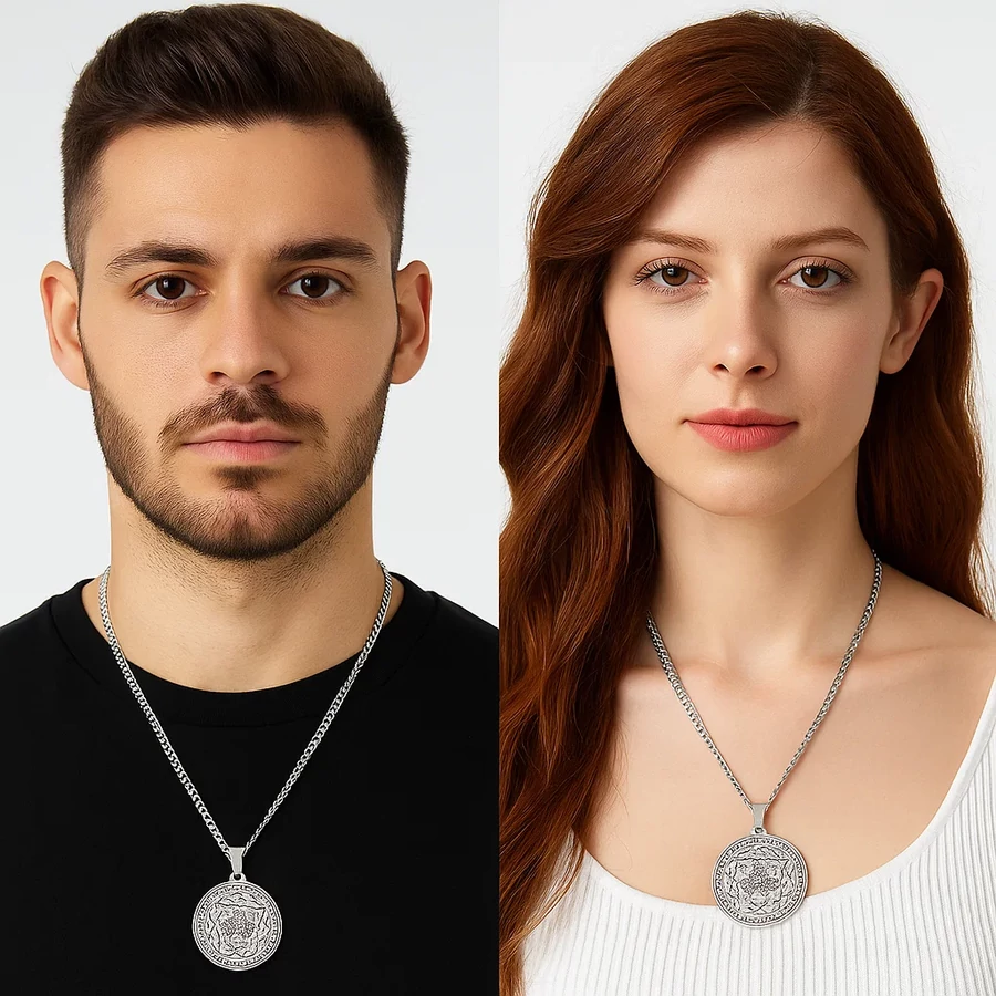 A rozsdamentes acélból készült nyaklánc nemcsak mutatós, hanem rendkívül tartós is. A 3 cm átmérőjű medált egy 60 cm hosszú lánc egészíti ki, amely kényelmes és biztonságos viseletet nyújt. Az ezüst fényű felület tisztaságot és harmóniát sugároz.