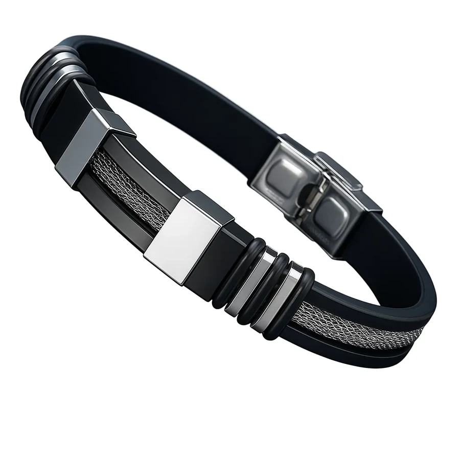 A karkötő acél és szilikon kombinációjával készült, így rendkívül ellenálló a kopással és a mindennapos használattal szemben. A puha szilikon jól illeszkedik a csuklóra, míg a fényes acél elemek férfias és elegáns megjelenést kölcsönöznek. A csatos zár praktikus és biztonságos.