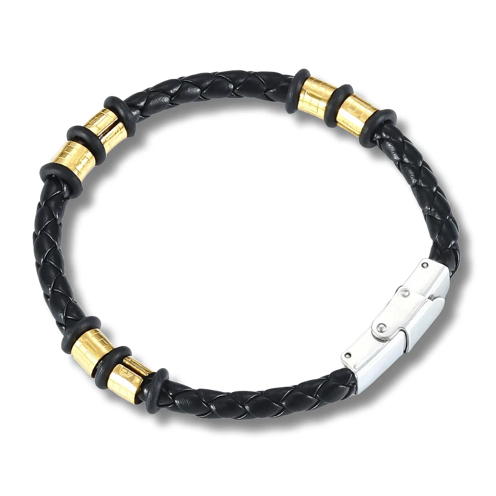 Ez a acél fonott bőr karkötő egyesíti a klasszikus eleganciát és a modern stílust. A fekete színű, gondosan megmunkált bőrszíjat arany színű acél díszítőelemek törik meg, így egyedi kontrasztot teremtve. Az ezüst színű acél csatok erős tartást és időtállóságot biztosítanak, így ez a karkötő ideális mindennapi viselethez és alkalmi megjelenéshez egyaránt.
