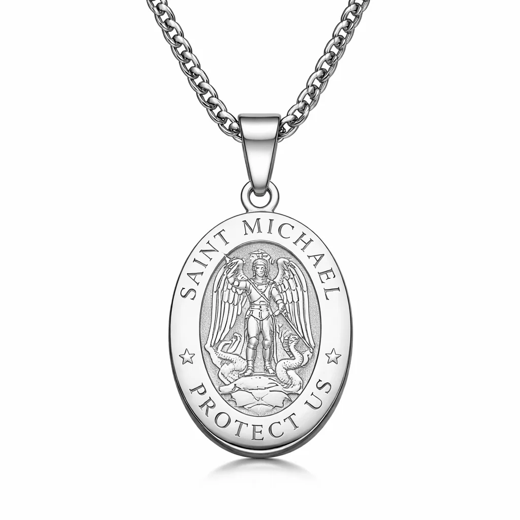 Az acél Szent Mihály védelmező nyaklánc a hit, az erő és a védelem ősi jelképeit hordozza magában. A medálon megjelenő :contentReference[oaicite:0]{index=0} alakja a gonosz feletti győzelmet, az igazság védelmét és a lelki bátorságot szimbolizálja. Ez az ékszer nem pusztán dekoratív elem, hanem mély jelentéssel bíró jelkép.