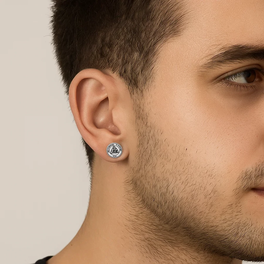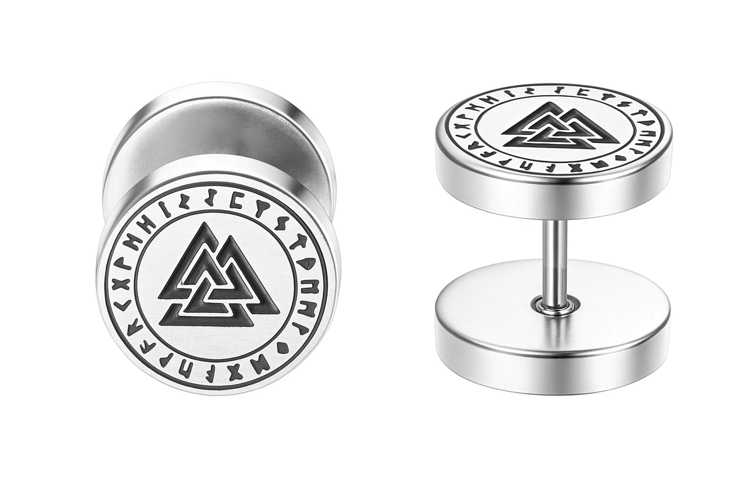 Az ezüst színű acél Valknut viking fülbevaló a férfiak számára tervezett kifinomult és erőteljes kiegészítő lehet.