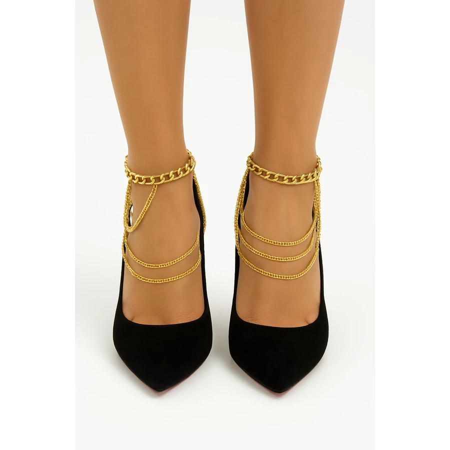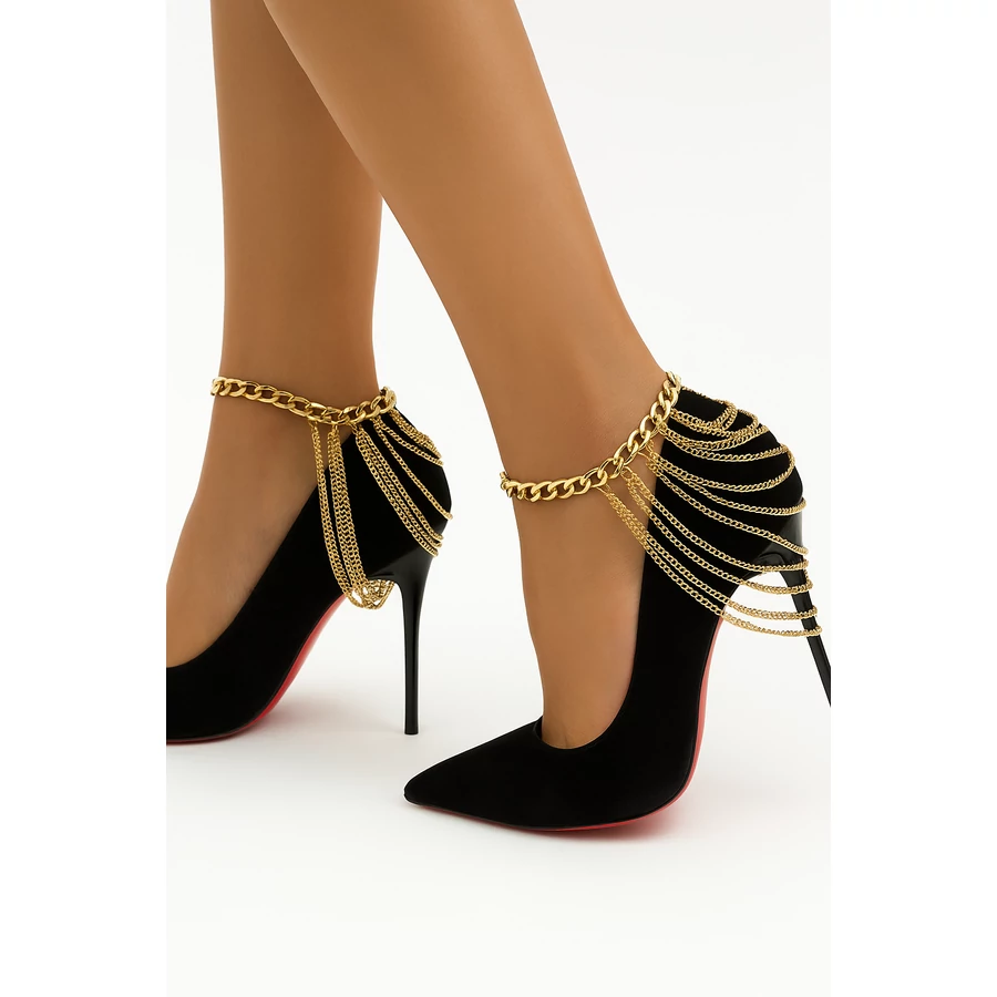 Ez a arany színű cipőlánc magassarkúra tervezett kiegészítő tökéletes választás, ha igazán látványos és divatos megjelenésre vágysz. A sokszoros láncstruktúra elegánsan omlik végig a cipő sarkán, miközben finoman körbeöleli a bokát. Egyediségével garantáltan kitűnsz a tömegből – legyen szó fotózásról, buliról vagy egy különleges eseményről.