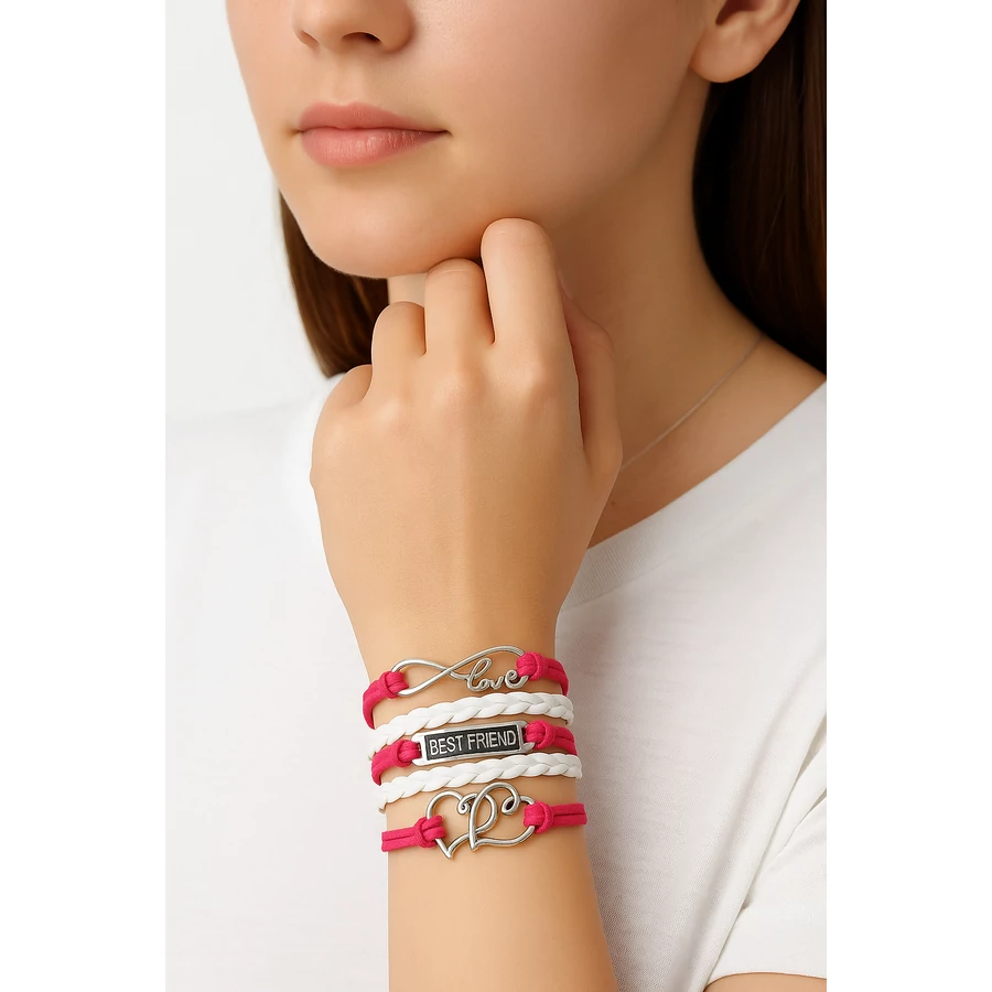 A barátság karkötők mindig is az összetartozás és a közös élmények jelképei voltak. Ez a színes „Love” és „Best Friend” feliratú medálokkal díszített karkötő tökéletes választás, ha szeretnéd meglepni a legjobb barátnődet egy szívhez szóló ajándékkal. A fehér és rózsaszín színek harmonikus kontrasztot alkotnak, míg a szív alakú dísz még inkább kifejezi a köztetek lévő különleges kapcsolatot.