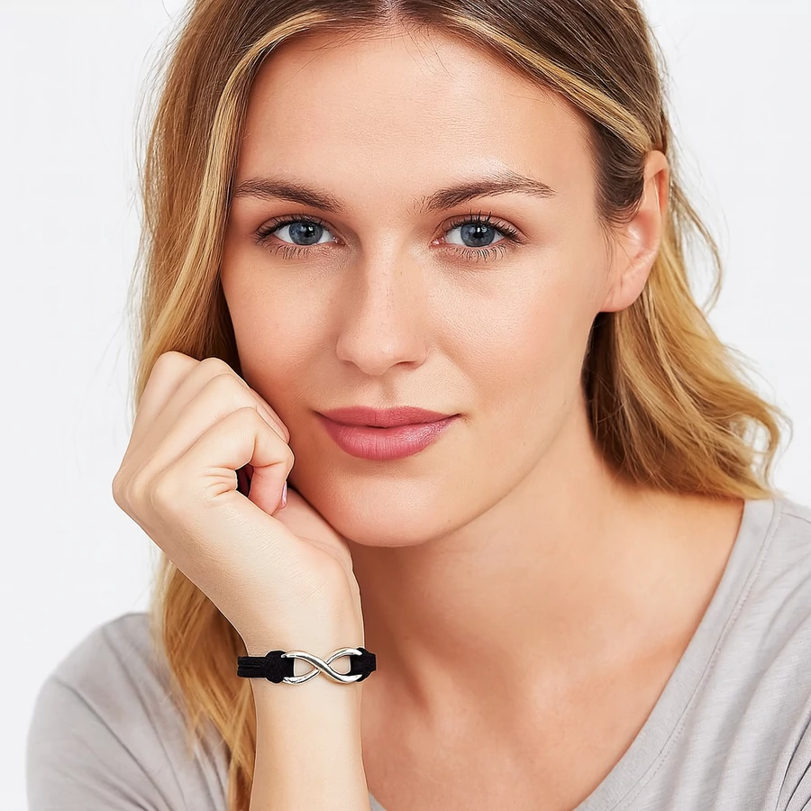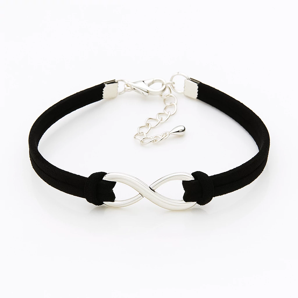 A fekete, fonott bőrpánt és az ezüstszínű fém végtelen jel tökéletes összhangban vannak, így ez a karkötő egyszerre modern és időtlen. Uniszex kialakítása révén bármely korosztálynak és nemnek remekül áll – legyen szó barátokról, párokról vagy családtagokról.