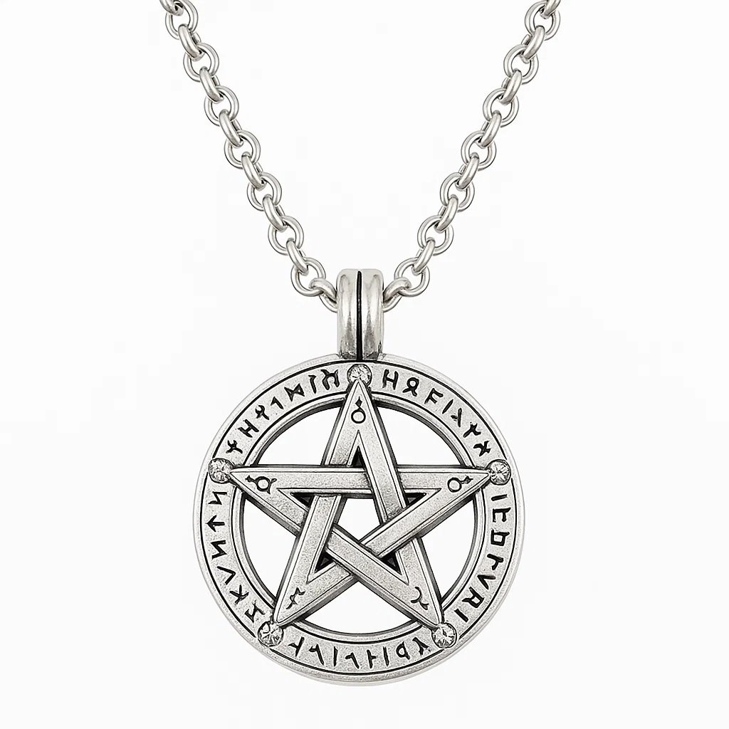 A nyaklánc fémötvözetből készült, amely garantálja a hosszú élettartamot. Az ezüst színű medál átmérője 2,5 cm, míg a lánc 52 cm hosszú, így kényelmes viseletet nyújt a mindennapok során. A pentagram formája letisztult, mégis hatásos megjelenést biztosít, amely kiemeli a nyaklánc különlegességét.