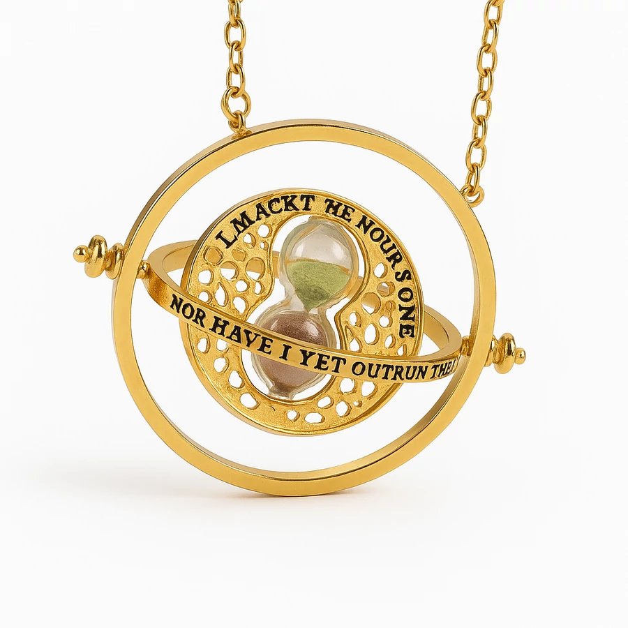 A Hermione időnyerő nyaklánc (mini) a varázsvilág rajongóinak egyik legkedveltebb darabja, amely most egy bájosabb, 3 cm-es medállal készült. A három koncentrikus gyűrűből álló, forgatható szerkezet közepén egy aprólékosan kidolgozott homokóra található, amely az időutazás szimbólumát idézi meg. Ez a kisméretű, arany színű ékszer elegáns, mégis játékos kiegészítő, amely tökéletesen visszaadja a Harry Potter történetek varázslatos hangulatát.