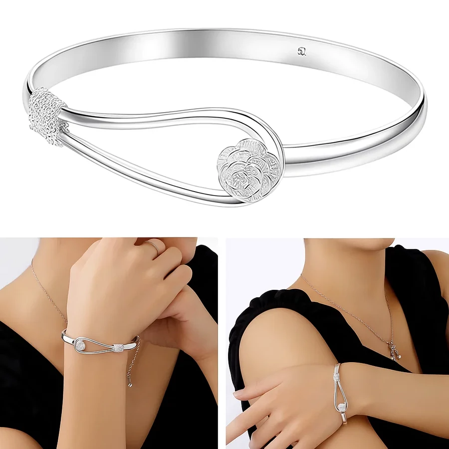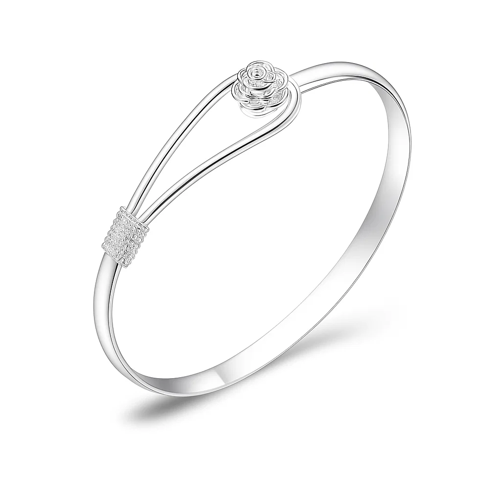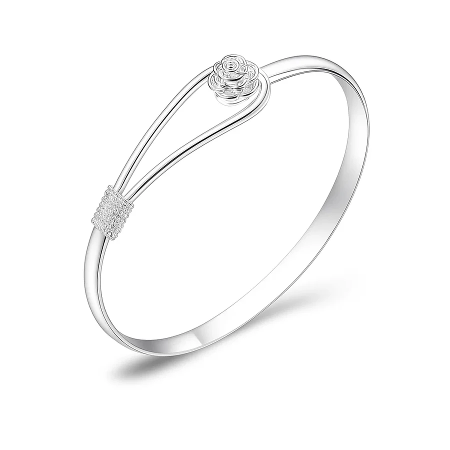 Különleges ezüst karperec nőies rózsadíszítéssel. Tökéletes választás, ha eleganciát és stílust szeretnél hozzáadni megjelenésedhez.