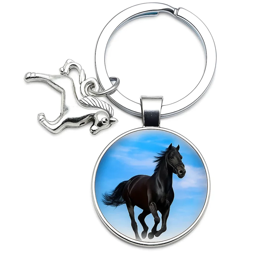A kétmedálos lovas kulcstartó tökéletes ajándék azoknak, akik rajonganak a lovakért és a lovaglás világáért. Egy üvegből készült medál és egy részletgazdagon kidolgozott, ezüst színű ló alakú fémmedál kombinációja teszi igazán különlegessé ezt a kiegészítőt. A fekete ló fotója kék háttérrel elegáns és modern megjelenést kölcsönöz, míg a vágtázó ló szimbóluma a szabadságot és az erőt jeleníti meg.