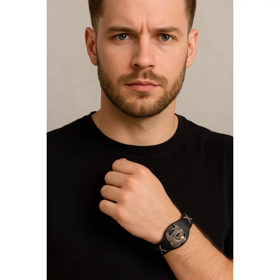 A karkötő puha, strapabíró bőrből készült, amely kényelmes a csuklón, míg a díszítőelem fémötvözetből készült, ami hosszú élettartamot biztosít. A részletek precízen kidolgozottak, a bőr-fém kombináció pedig modern és karakteres megjelenést ad a kiegészítőnek.