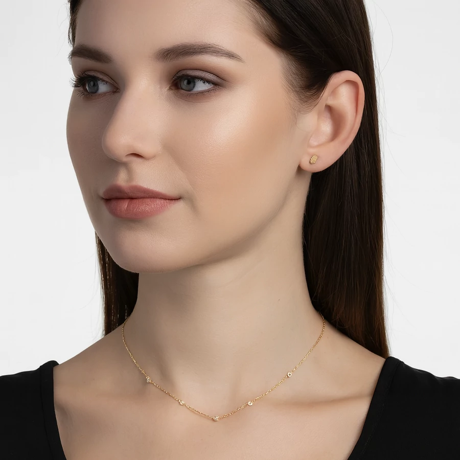 Az öt kristályos aranyozott nyaklánc eleganciát és nőiességet sugároz, amely bármely alkalomhoz tökéletes választás. A kristályok finom csillogása és az aranyszínű lánc letisztult vonalai harmonikus összhangot teremtenek, így ez az ékszer könnyedén feldobja mind a hétköznapi, mind az ünnepi szetteket.