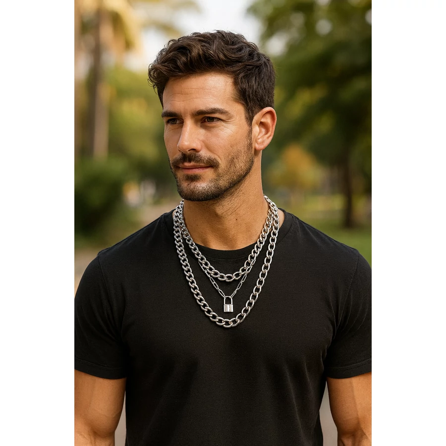 Ez a háromsoros lakatos punk nyaklánc azonnal magára vonzza a tekinteteket, és tökéletes választás a punk nyakláncok és rock stílusú kiegészítők rajongóinak. A három különböző hosszúságú, masszív lánc és a központi lakatmedál erőteljes, merész megjelenést kölcsönöz, amellyel könnyedén kifejezheted az egyéniségedet. Ez a darab remek választás koncertekre, fesztiválokra, bulikra, vagy bármilyen alkalomra, amikor szeretnél kitűnni a tömegből.