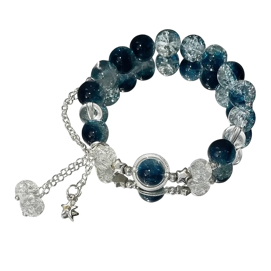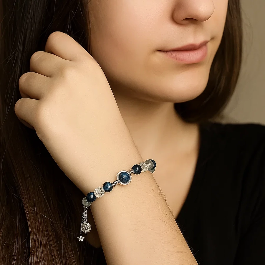 A karkötő minőségi fémötvözetből és csillogó gyöngyökből készült, amelyek fényben ragyogva teszik különlegessé az ékszert. A kék és átlátszó árnyalatok eleganciát és romantikus hangulatot sugallnak, így a romantikus ékszerek között igazi különlegességnek számít. Az állítható méret biztosítja a kényelmes viseletet, így bárki számára ideális választás lehet.
