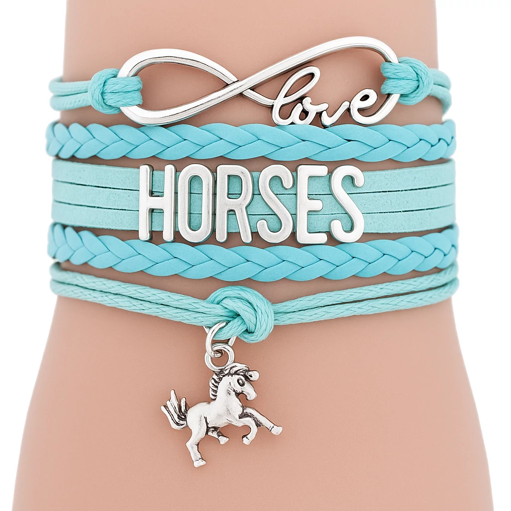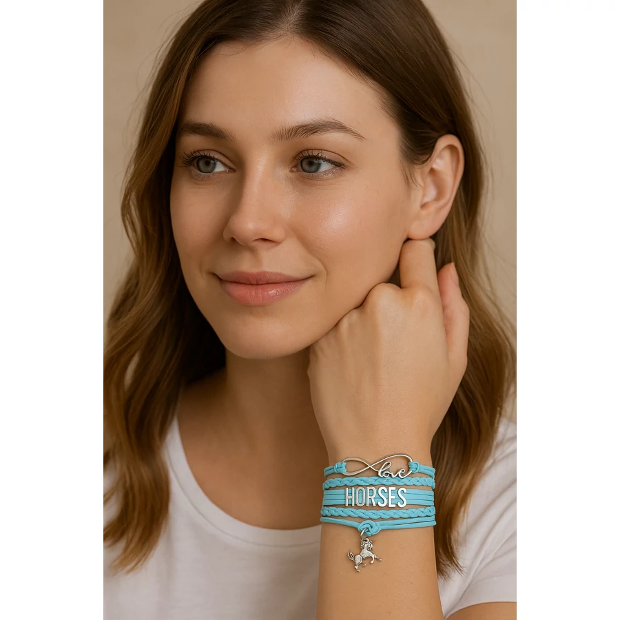 Ez az ötsoros bőr lovas karkötő különleges darab minden lókedvelő számára. A „Szeretem a lovakat” feliratok és a lómedál kifejezik, amit te is érzel – tisztelet, szeretet és szabadság. A fekete, fehér és türkiz színekben elérhető karkötő erőteljes stílusával tökéletes kiegészítő a hétköznapokban és különleges alkalmakkor is.