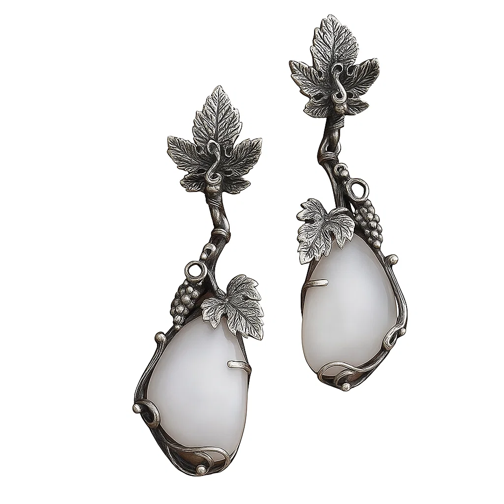 Ez a szőlőfürtös opálos fülbevaló igazi különlegesség, amely az eleganciát és a gótikus stílus kifinomult jegyeit ötvözi. Az ezüst színű foglalat aprólékosan megmunkált szőlőfürt motívuma és az áttetsző-fehér opál kő együtt lenyűgöző látványt nyújtanak. Egy ilyen opálos női fülbevaló nemcsak kiemeli viselője stílusát, hanem finom, nőies ragyogást is kölcsönöz, akár hétköznap, akár elegáns alkalmakon viselik.