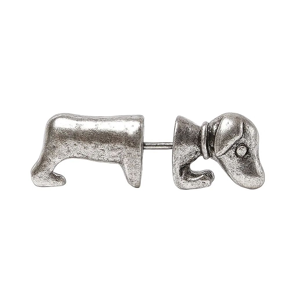 Ez az ezüst színű tacskó fülbevaló a kutyabarátok egyik kedvenc ékszere, amely játékos formájával és elegáns megjelenésével azonnal magára vonja a figyelmet. A háromdimenziós tacskó motívum hűen adja vissza a fajta jellegzetes vonásait: hosszú test, rövid lábak és bájos fülek. Ez a kutyás ékszer tökéletesen kiegészíti mindennapi öltözetedet, ugyanakkor alkalmi viselethez is remek választás.