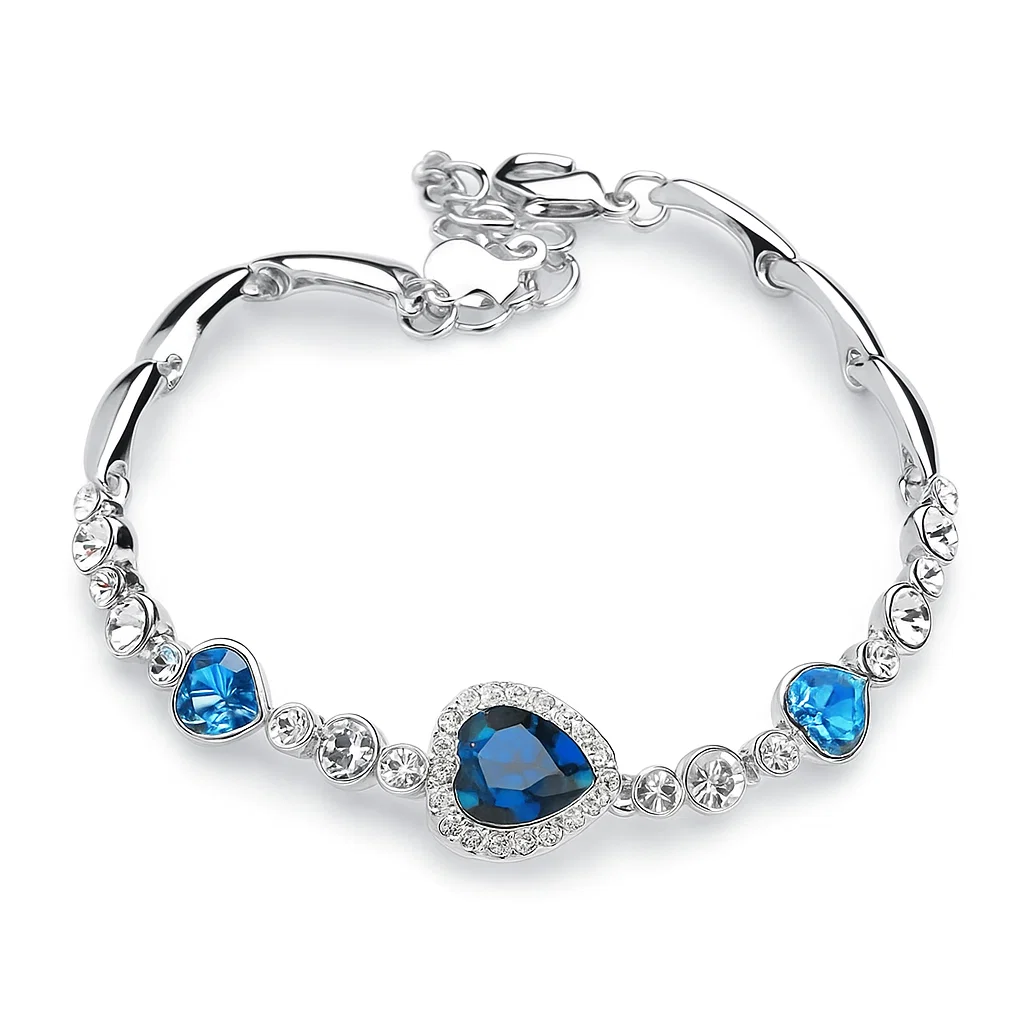 Titanic ihlette „Az óceán szíve” karkötő, ragyogó zafírkék kövekkel és állítható hosszúsággal. Különleges ajándék és stílusos kiegészítő.