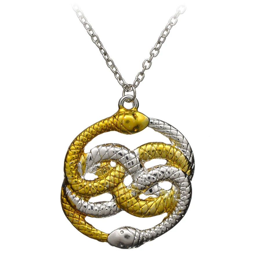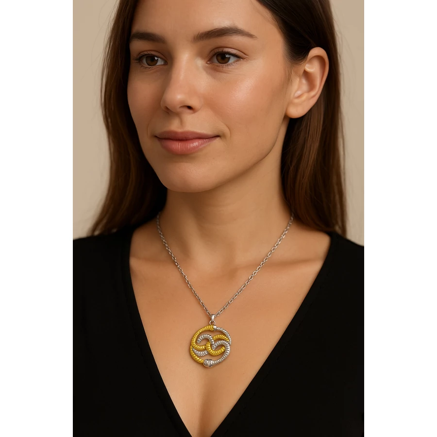 Ez a különleges Végtelen történet nyaklánc a kultikus fantasy film ikonikus jelképét, a két összefonódó kígyót idézi meg. Az arany és ezüst szín kombinációja elegáns, mégis látványos megjelenést kölcsönöz ennek az ékszernek, amely egyszerre szimbolikus és divatos kiegészítő. A medál a végtelenség és az örökkévalóság jelképe, így mélyebb jelentést hordoz, mint egy átlagos nyaklánc.